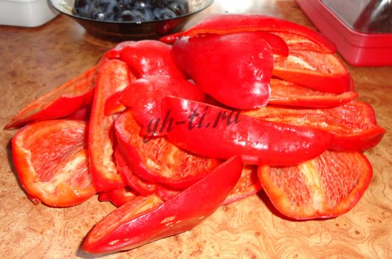 Сладкий красный перец режем пополам, удаляем косточки и промываем.