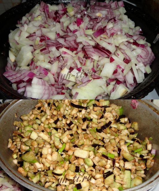 Морковь натираем на терке, баклажаны и лук режем кубиками