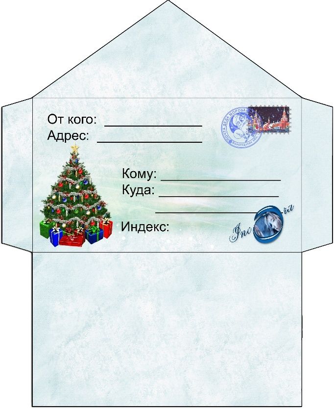 Можно взять и настоящий конверт, да и адрес у Деда Мороза имеется в поле реальный: Индекс: 162390, Вологодская обл., город Великий Устюг, Октябрьский пер., дом 1А, Почта Деда Мороза, Деду Морозу.