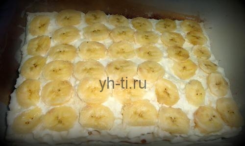 Теперь нужно придать нашему торту «изюминку». Ее станет банан и шоколадная стружка. Банан нужно порезать кружочками и выложить поверх торта, а затем посыпать сверху шоколадной стружкой. Как сделать стружку, думаю, вы догадываетесь.