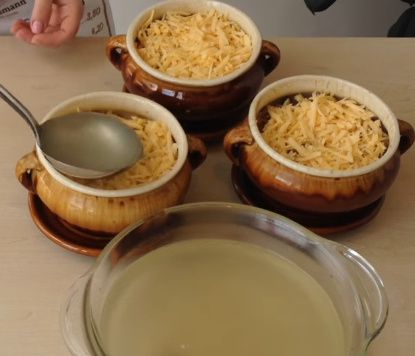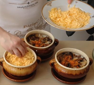 Сверху кладем натертый сыр. Заливаем водой или бульоном. Закрываем крышками и помещаем холодную в духовку на час при температуре 150 градусов.