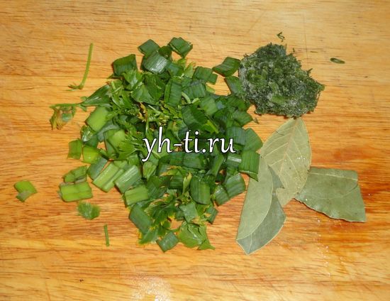 Зеленый лук, укроп (на фото он замороженный) и лавровый лист…