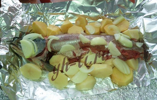 Рыбу мы очищаем, обмазываем солью. Картофель тоже чистим и режем на крупные ломтики, добавляем к нему репчатый лук и соль, все перемешиваем. Выкладываем горбушу с картошкой в фольгу, заворачиваем и отправляем на противне в духовку. Выпекаем при 180 градусах около 40 минут (духовка была не нагретая!).