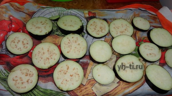 Баклажан моем и нарезаем кружками. Помещаем кружки в холодную подсоленную воду, чтобы вышла горечь. Спустя полчаса можно их достать и обсушить на полотенце.