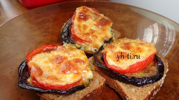 Можно запекать сразу с хлебом в духовке. А кто-то любит и вовсе без хлеба. Можно даже не запекать в духовке, а просто выложить на жареные баклажаны помидоры и чесночно-сырный соус. Выбирайте любой понравившийся способ и готовьте с удовольствием. Приятного аппетита!