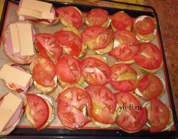 Намазываем соус на кусочки хлеба, сверху кладем жареные кабачки. Затем помидоры, нарезанные кружочками. (Ряд слева на фото — простые горячие бутерброды без кабачков и без томатов.)