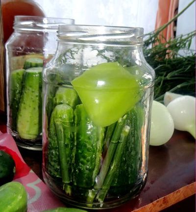 Закладываем второй ряд огурцов, добавляем укроп и лук