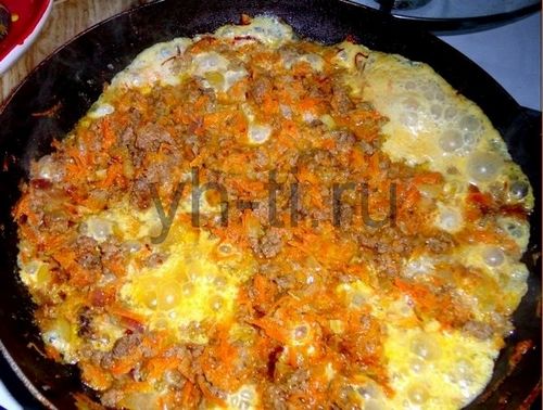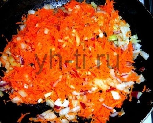 Шаг 1. Растопите в сковороде 30 г сливочного масла и влейте пару-тройку ложек растительного масла. Нарежьте мелкими фракциями лук (1 большая головка или две маленькие) и одну морковь. Отправьте овощи в сковороду и пассируйте 10 минут.