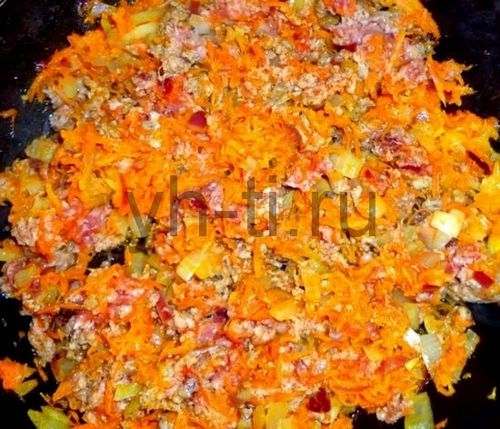 Шаг 2. Бекон мелко порежьте или перекрутите вместе с телятиной в фарш. После добавьте смесь фаршей к овощам и продолжайте обжаривать все вместе еще минут 10 на сильном огне.