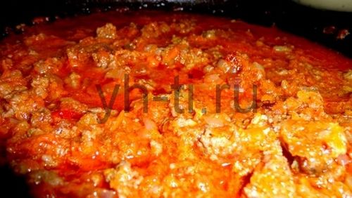 Шаг 6. Затем залейте соус болоньезе бульоном, посолите по вкусу, прикройте крышкой и убавьте огонь. Болоньезе должно томиться хотя бы пару часов. За 5 минут до готовности добавьте в ароматное блюдо красный и черный молотые перцы, а также мелко нарезанные зелень и чеснок.