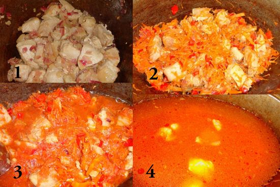 В хорошо разогретом казане обжарьте на сильном огне на подсолнечном масле (в идеале на бараньем курдюке) мясо (300-400 гр.). Какое именно мясо выбрать — дело вашего вкуса. Мне больше всего нравится курочка, с ней лагман получается наиболее вкусным. Когда на мясе появится аппетитная золотистая корочка, добавьте две мелко нарезанные луковицу. Примерно через пару минут, когда лук станет немного золотистым, добавьте нарезанные тонкой соломкой морковь (2-3 в зависимости от размера) и один балгарский перец. Также по желанию можно добавить немного редьки или репы (примерно 1/3 часть плода). Обратите внимание на то, что редька придает специфический вкус, который может понравится далеко не всем.