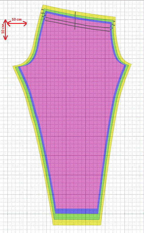 Вариант №2. Ниже можно увидеть чертеж лекала леггинсов на сетке в трех размерах — S = розовый, M = синий, L = Зеленый, XL = желтый. Перенесите чертеж на бумагу, учитывая, что размер одного большого квадрата 10 х 10 см, размер каждого маленького квадратика 2 х 02 см.