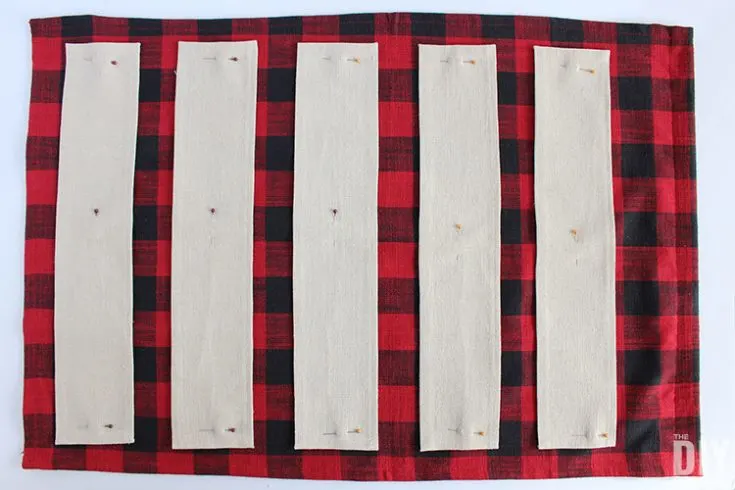 Шаг 7 : Расположите 5 полосок по центру ткани в клетку «буффало» на расстоянии 4 см друг от друга и закрепите булавками. Я разместила верхнюю полоску на расстоянии 9 см от верха, а нижнюю — на расстоянии 3 см от низа.
