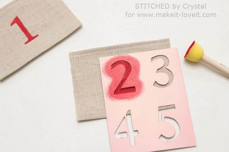 Разрежьте полоски на части для карманов шириной 12 см. Вам понадобится 24 штуки. Подверните и обработайте края. С помощью трафаретов и краски нанесите цифры. Пришейте кармашки к основной детали. Для удобства кармашки можно приклеить клеем-карандашом, а уже потом проложить строчки.