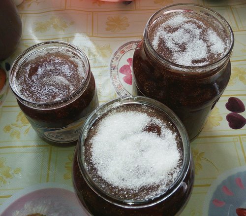 Помощник у мамы только один)) Второй — соседский)) Засыпаем сахаром только сверху (1 — 2 ст. ложки). Нам и нужно, чтобы верхушка затвердела, такая сахарная крышка защитит от поесени.