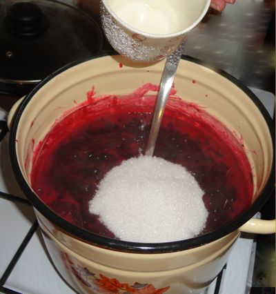 Теперь выключаем плиту и начинаем вводить сахар из расчета 1,5 стакана на 1 литр смородины, постепенно перемешиваем до полного растворения сахара. Если сахар плохо растворяется, можно ненадолго включить огонь под кастрюлей и постоянно перемешивать.
