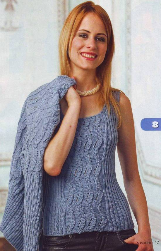 Этот жилет из меланжевой пряжи я тоже решила добавить в подборку. Ведь наверняка найдутся и те, кому понравятся и будут удобны короткие рукавчики. А узор из кос, безусловно, не оставит равнодушным никого.