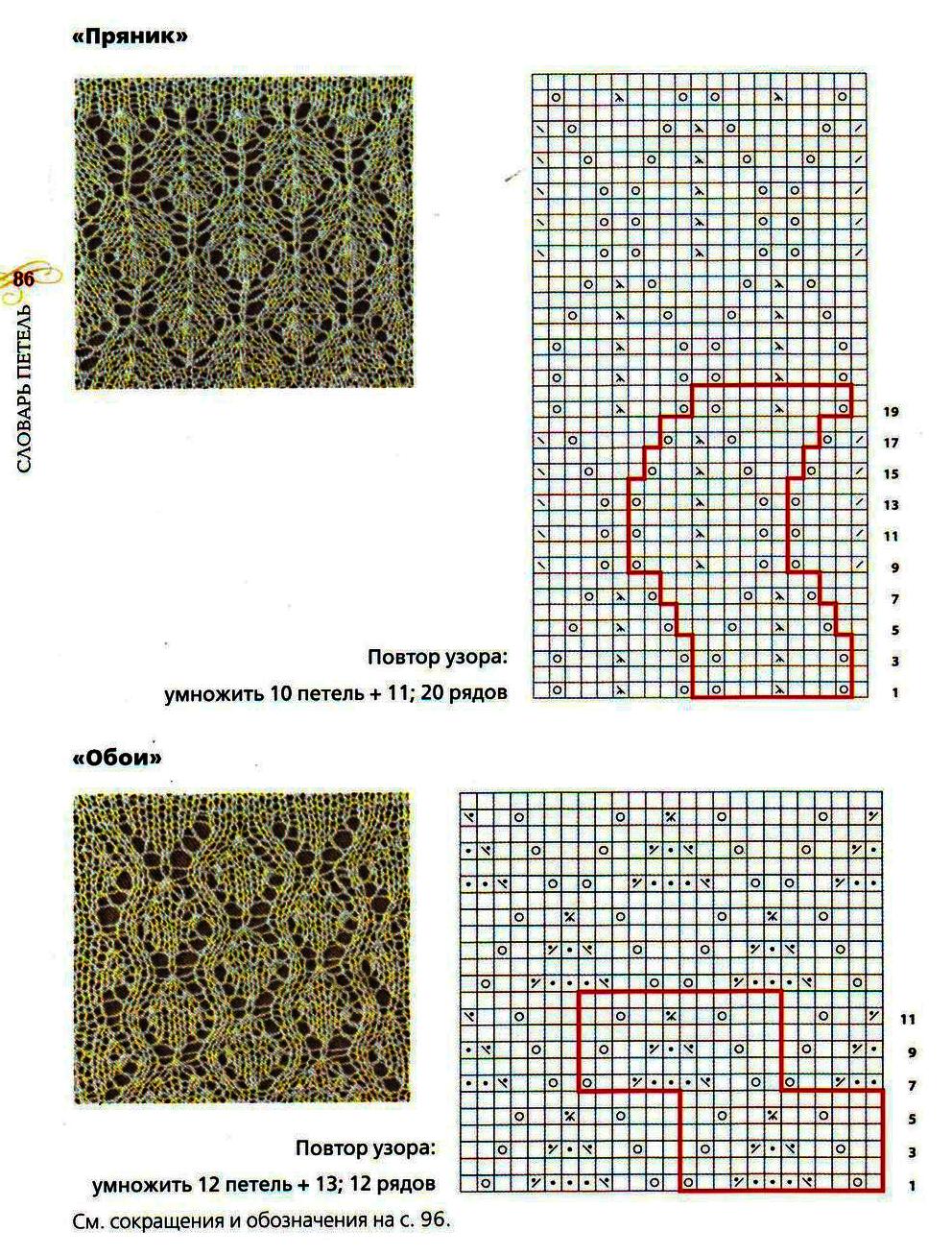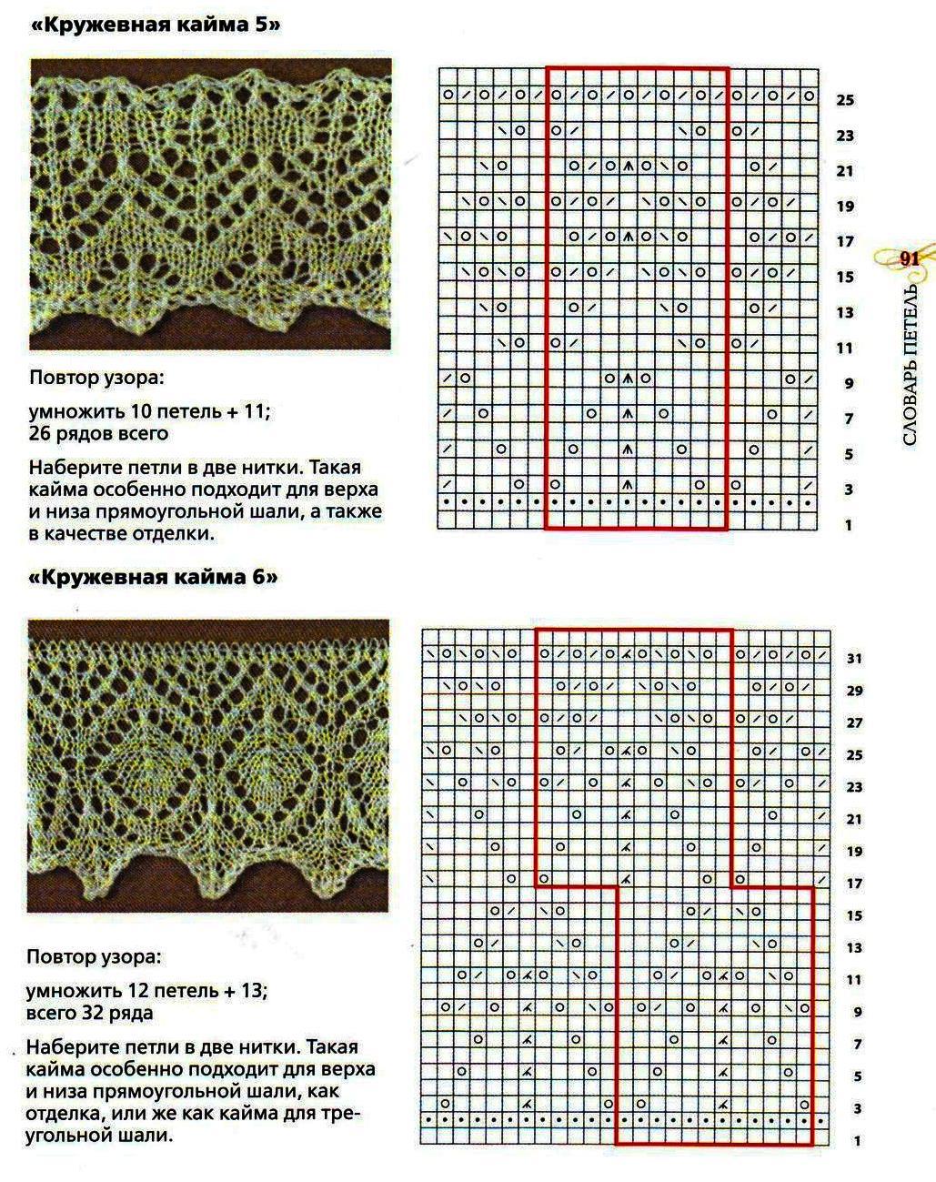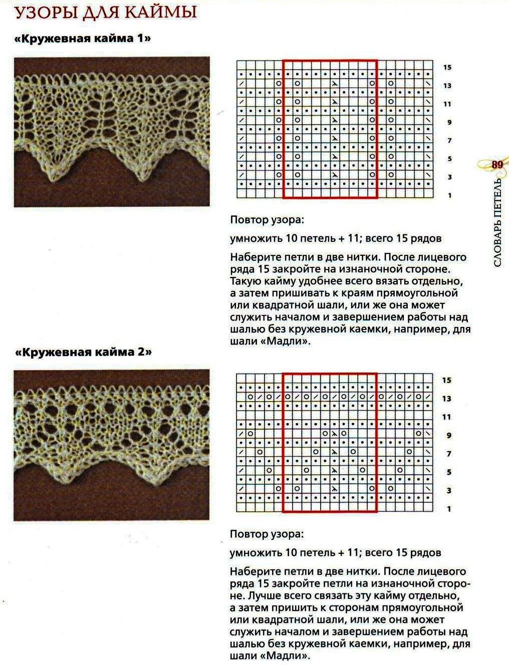 В опубликованных выше схемах шалей показаны популярные узоры, однако есть еще масса интереснейших вариантов. Вы можете подобрать другой узор для каймы или центральной части и связать свою шаль, единственную в своем роде.