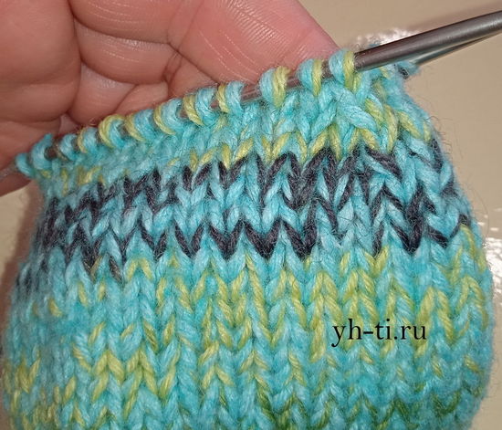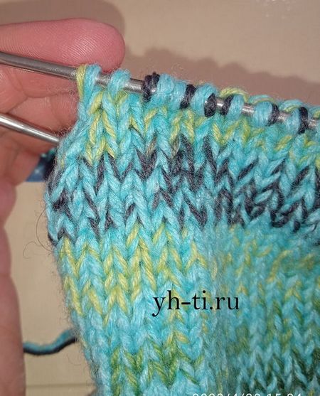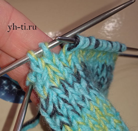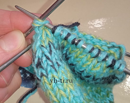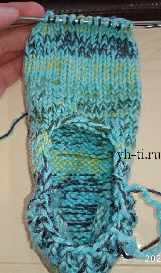 Провязав 3-4 см после пятки, нужно добавить петли и сомкнуть вязание в круг