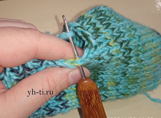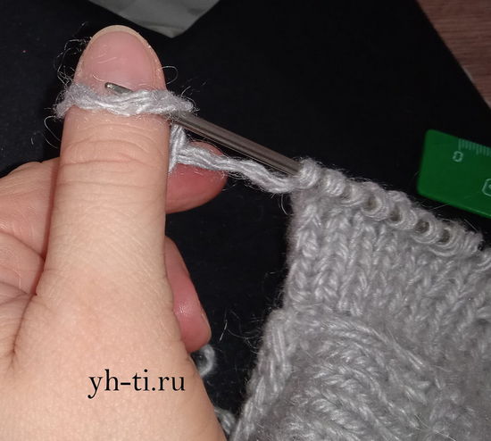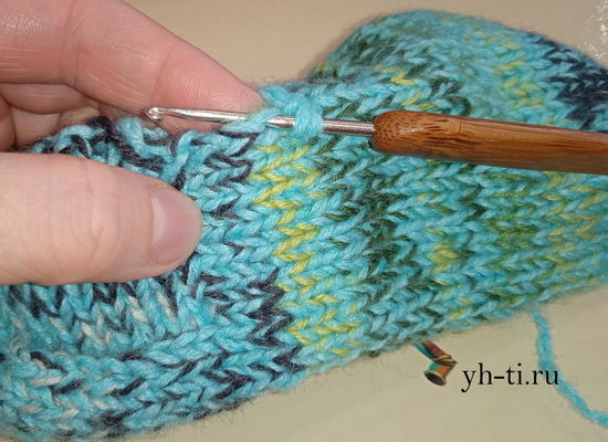 Но мне больше нравится вариант обвязки крючком. Для этого берем крючок, на полразмера меньше, чем спицы, которыми вязали. В моем случае это крючок №2,5.