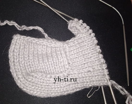Когда высота стенки будет 6-7 см можно приступать к формированию нижней части пятки. Будем вязать самую обычную квадратную пятку (МК по такой пятке есть). Также можно вязать и круглую.