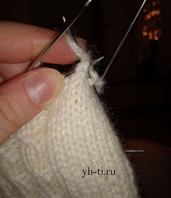 Петли, которые мы переснимали на нитку, возвращаем на спицы. Дополнительно набираем петли по верху. У меня получилось всего 18 петель (13 было и еще пять подняла с верхней части).