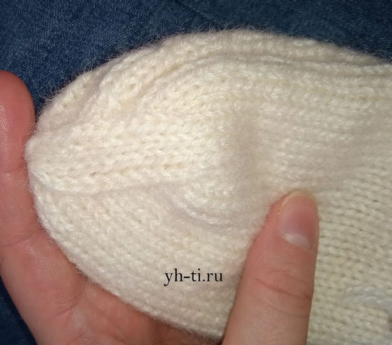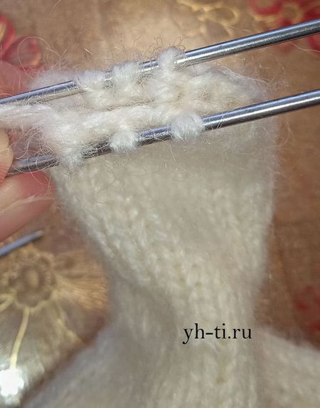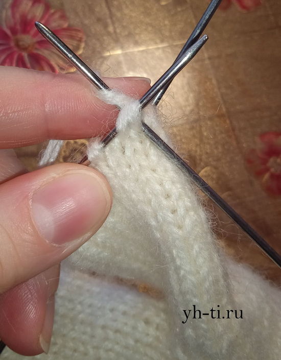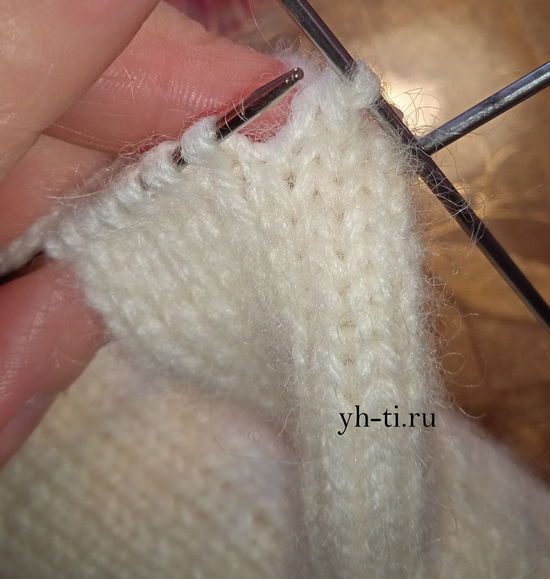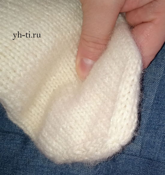 Прибавки делаем в каждом втором ряду. Я делала прибавку своеобразной петлей, на фото ниже это видно. Но можно делать и обычный накид. Только провязывать накид нужно будет скрещенным, чтобы не оставалось дырочек.