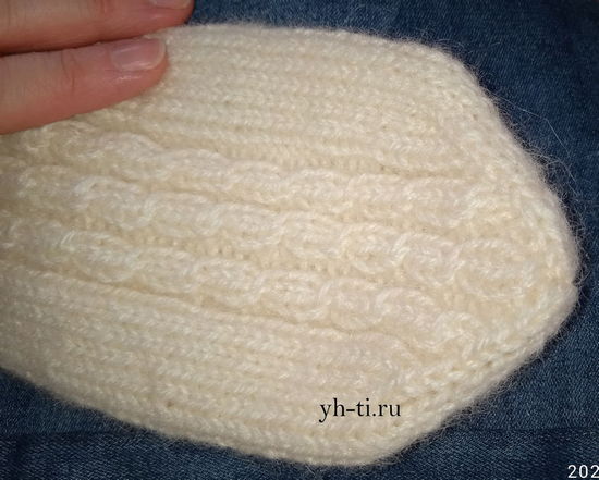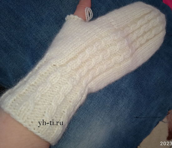 Сначала я вязала правую варежку. С тыльной стороны я продолжила три ряда жгутиков. Если вяжите варежки с индийским клином впервые, то лучше обойтись без узоров, чтобы не запутаться.