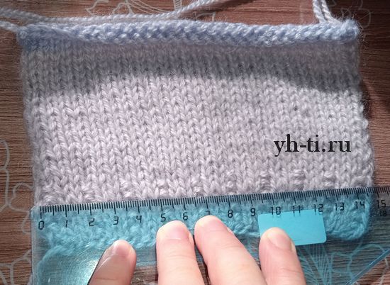 У меня был связан образец из 30 петель. Ширина участка с резинкой 15 см. А ширина лицевой глади 16 см. Значит в 1 см лицевой глади будет помещаться: 30:16=1,875 петель.