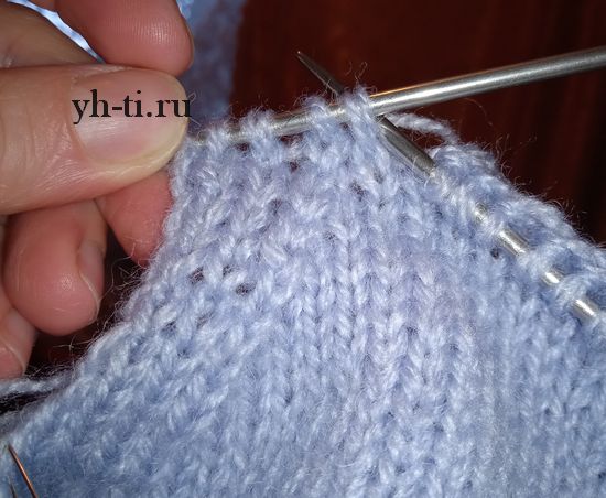 Теперь нам нужно обвязать горловину планкой. На спинке у нас петли остались открытыми, значит нужно только набрать петли по V-образному вырезу. Набираем по нему следующим образом: 2 петли поднимаем из кромочных, одну дополнительную из протяжки, затем вновь 2 — из кромочных, 1 — из протяжки. Другими словами, мы добавляем 1 петлю через каждые 2 поднятые петли из кромочных.