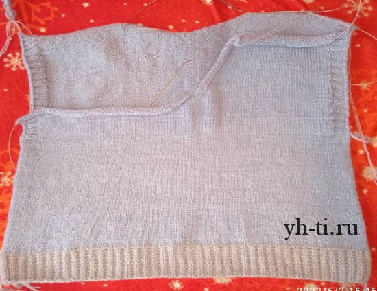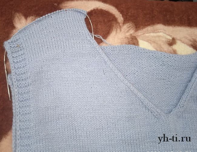 Вяжем перед до желаемой длины и после начинаем вывязывать V-образную горловину