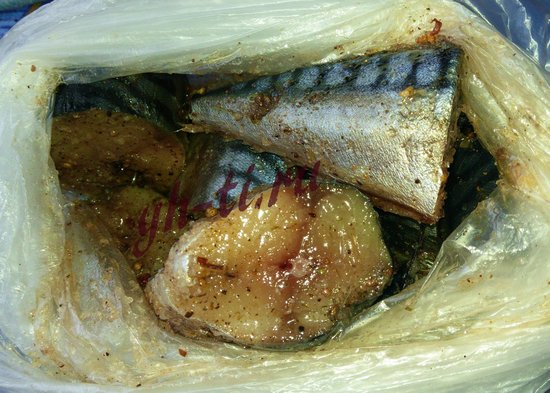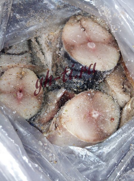 Рыбу чистим, промываем и режем на куски. Смешиваем соль, сахар и приправы. Я все засыпала в целлофановый пакет, туда же закидываем рыбу, тщательно все перемешиваем. Пакет завязываем, ставим в тарелку и убираем в холодильник.