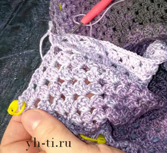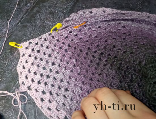 Вяжем мотивы до нужной ширины. В процессе работы скрепляем шестиугольники маркерами и делаем примерки.