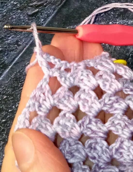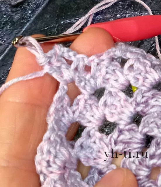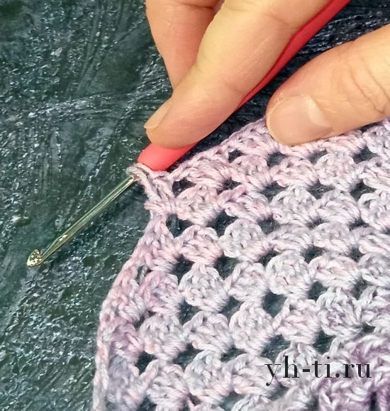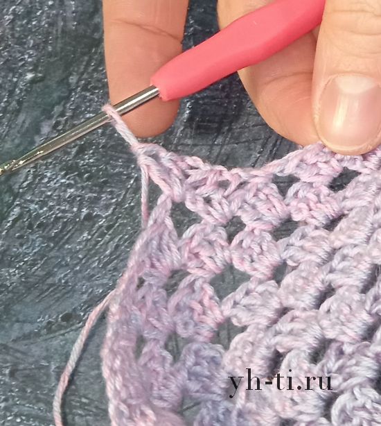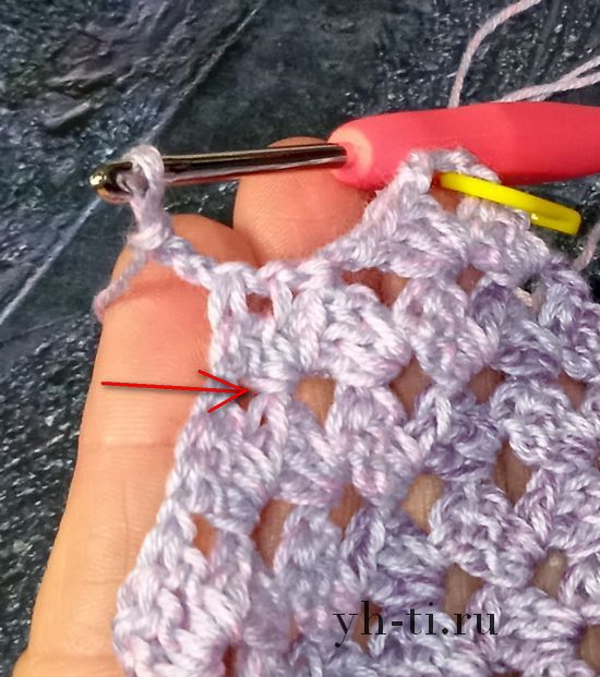 Следующие ряды вяжем так же: 3 воздушные петли и 2 столбика с накидом под эту же арку (показываю на фото крючком)