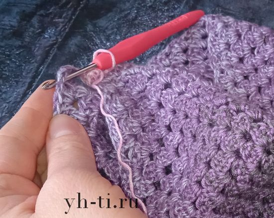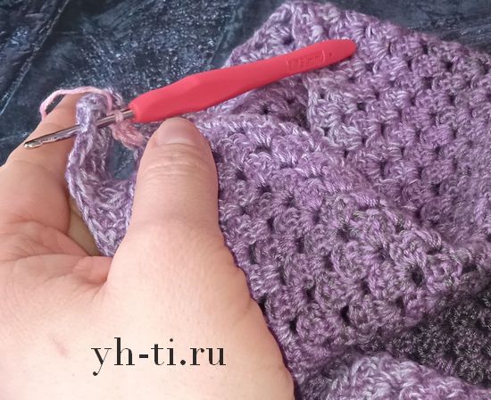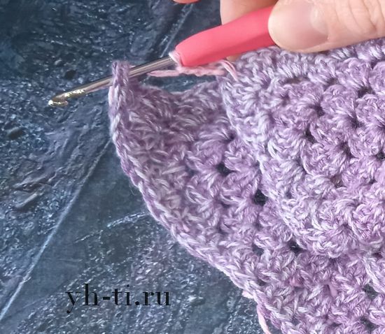 Когда останется дойти до края 3 арочки, останавливаемся. И вяжем так: под первую арку 1 столбик с накидом, 2 столбик с накидом не до конца (на крючке 2 петли). В следующую арку 1 столбик с накидом (на крючке 3 петли) и закончить одновременно все 3 столбика. Набрать 3 воздушные петли, развернуть работу. И провязать 2 столбика с накидом в след арку.