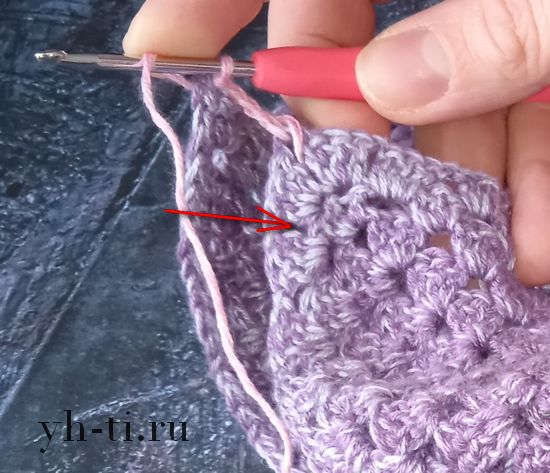 Провязываем три столбика с накидом в правую деталь (отмечено стрелкой)