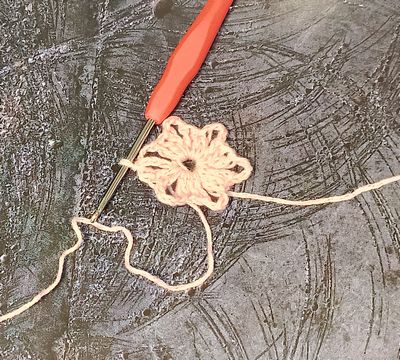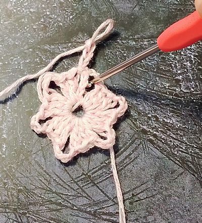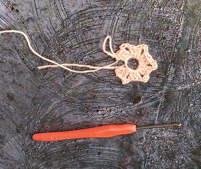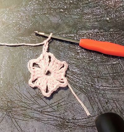 Мы должны провязать в кольцо 6 групп столбиков с накидом (в каждой группе по 3 ст. с накидом) и по 3 воздушные петли между группами.