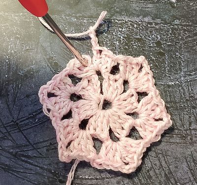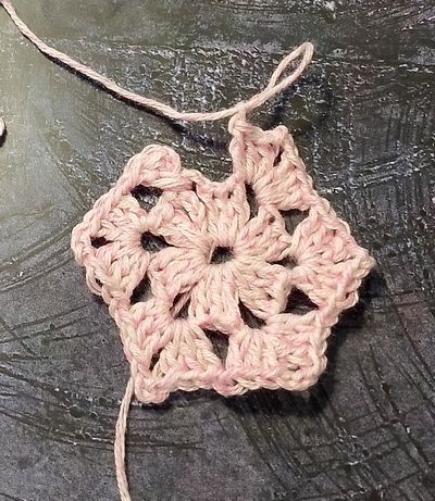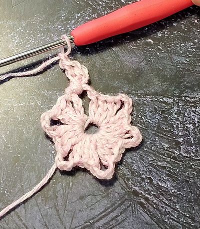 Провязав последние три столбика с накидом, делаем 3 воздушные петли и замыкаем ряд соединительным столбиком под начальную цепочку из воздушных петель. Должно получиться уже 12 групп из трёх столбиков с накидом. Уже вырисовываются углы нашего шестиугольника.