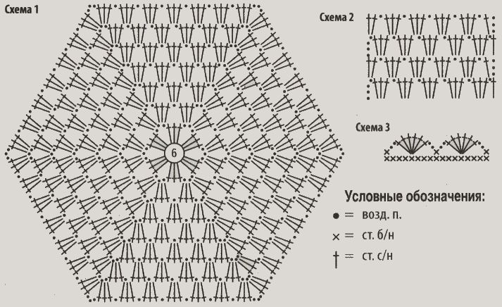 На самом деле схем шестиугольных мотивов много, я выбрала одну из самых простых. В основе лежат группы из трёх столбиков с накидом и одна воздушная петля между этими группами. Можно вязать по 2 воздушные петли, тогда кардиган будет более “дырчатый”. Ну, и опять же многое зависит от пряжи. Лучше попробовать связать образец и подобрать узор и крючок под свои нитки.