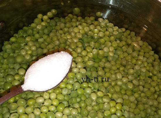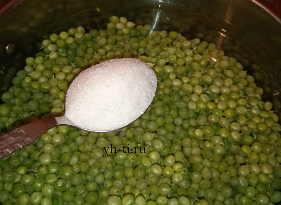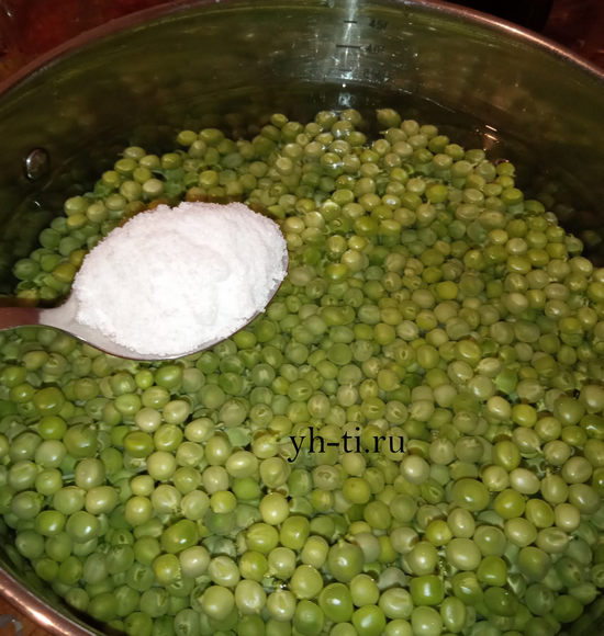 На 1 литр воды добавляем по 1 стол. лож. соли и сахара и половину чайной ложки лимонной кислоты. Так как у меня ушло 2 литра воды на горох, я добавила по 2 столовые ложки соли и сахара и 1 чайную ложку лимонной кислоты. Всё ложки с горками.