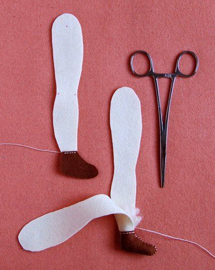 Приступайте к соединению деталей ног, начиная снизу. Заполните ногу до колена, затем проложите несколько стежков в области колена. чтобы сформировать сгиб. Продолжайте сшивать ногу. Заполните оставшуюся часть и зашейте. То же самое сделать и с другой ногой.