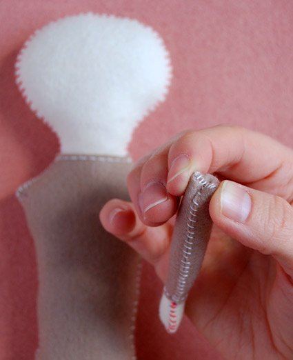 Пришейте голову к туловищу. Наполните голову и проложите строчку по шее.
