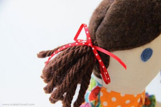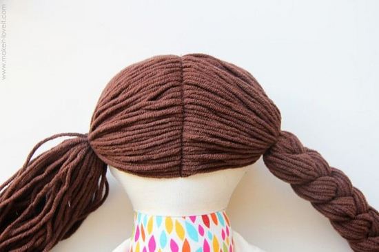 Обратите внимание, что при сшивании деталей головы, волосы из пряжи нужно отодвинуть. На готовой кукле волосы из пряжи соберите в два хвостики и из них заплетите косички. Косички снизу пришейте к голове двумя-тремя стежками.