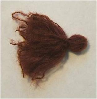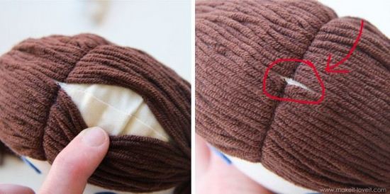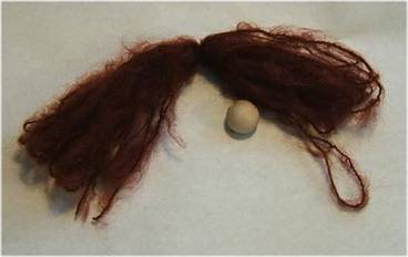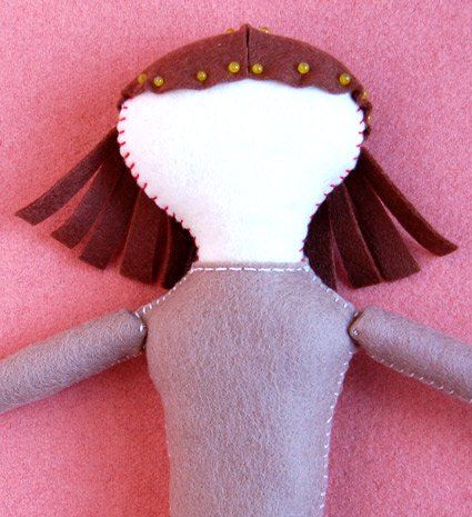 Для другой куклы использовались нитки и войлок. При сшивании частей головы пучки ниток нужно поместить на одну из деталей. Когда кукла будет вывернута на лицевую стороны, пучки будут аккуратно вшиты по бокам.