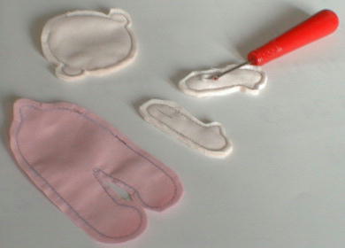 Теперь сложите детали туловища лицевыми сторонами вместе, руки при этом располагаются внутри. Проложите строчку. На изгибах головы и шеи сделайте надсечки.