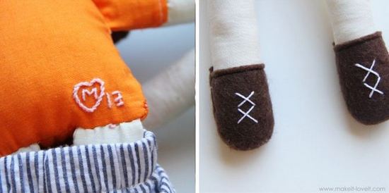 Дополняем ботинки кукол вышитыми “шнурочками”. Так же автор МК вышила на одежде буквы.