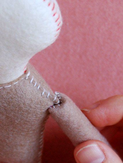 Теперь можно пришивать руки и ноги к туловищу. Начинайте с рук, как показано на фото ниже.