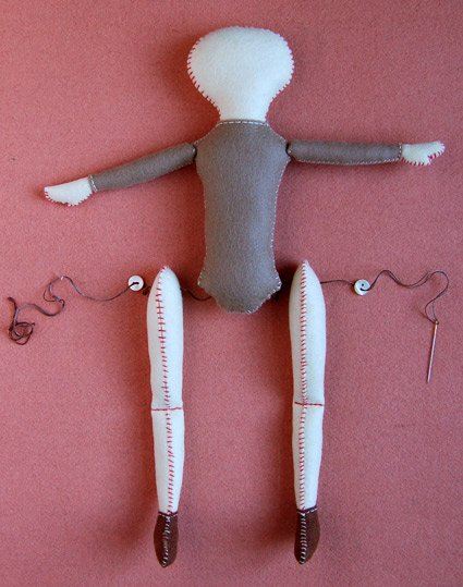 Пришивать ноги рекомендуется капроновой нитью. Еще потребуются две пуговицы. Приступайте к шитью, подробности на фото ниже.