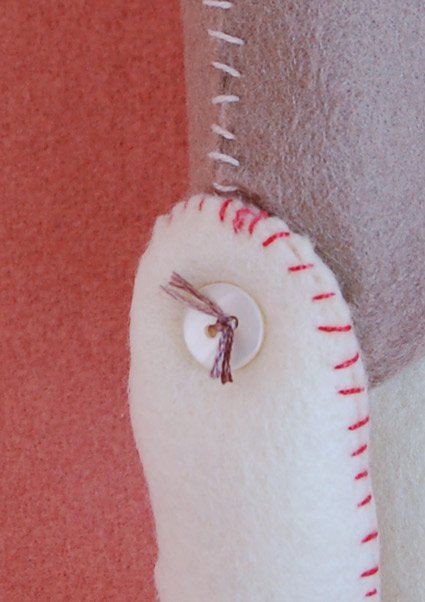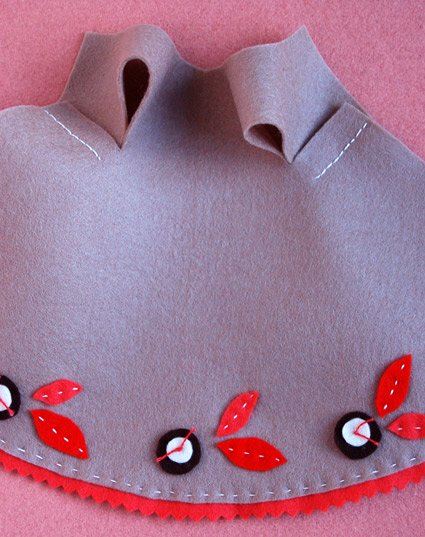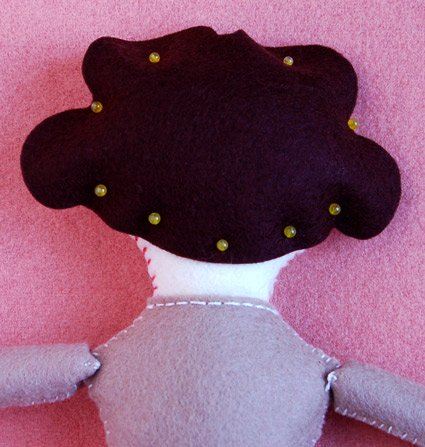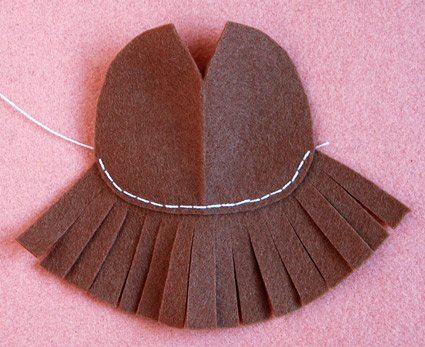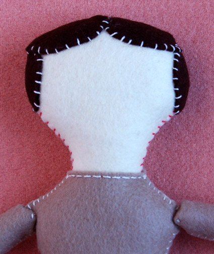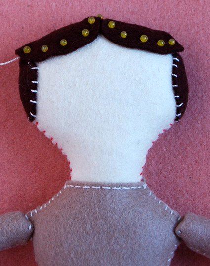 Если вы будете пришивать войлочные глаза и волосы, то это нужно делать на данном этапе. Волосы пришивать нужно по всему контуру, кроме нижнего закругленного края (на затылке).