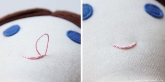 Сначала рисуем улыбку карандашом. Затем вышиваем вручную: начинаем шить с затылка, чтобы не было видно узелок. Прокалываем насквозь и вытягиваем иголку в уголке улыбки, шьем по линии, нарисованной карандашом. Заканчиваем и завязываем узелок там же — на затылке.